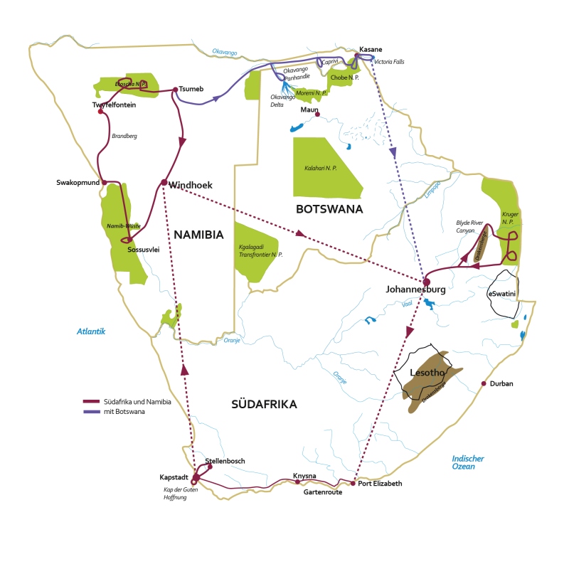 Reiseverlauf Namibia, Botswana, Südafrika (20/25 Tage)