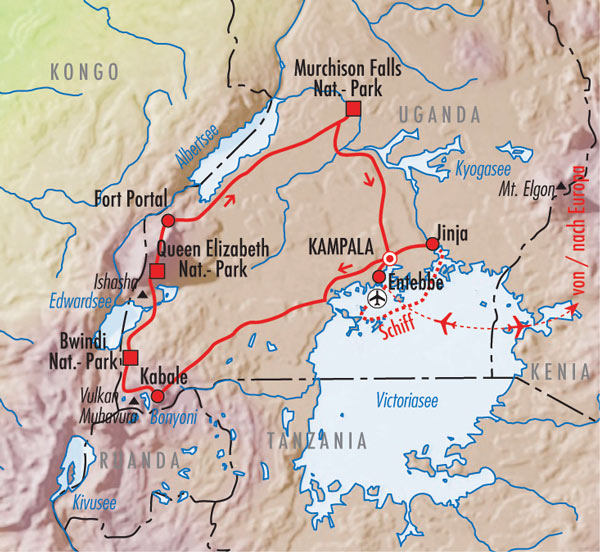 • Bei dieser kombinierten Zelt- und Lodgesafari zu teilweise entlegenen Plätzen in Uganda sind Flexibilität, etwas Verzicht auf Komfort, Toleranz und Mithilfe bei Gemeinschaftsarbeiten Voraussetzung. Vor allem bei der Bootstour auf dem Lake Victoria werden Teamgeist und Naturverbundenheit auf die Probe gestellt. Mit Änderungen im Tourablauf muss gerechnet werden. Wir erleben dafür herzliche Gastfreundschaft der Ugander, lernen die artenreiche Flora und Fauna der Nationalparks kennen und die Begegnung mit den Berg-Gorillas ist ein intensives Erlebnis, das wir niemals vergessen.