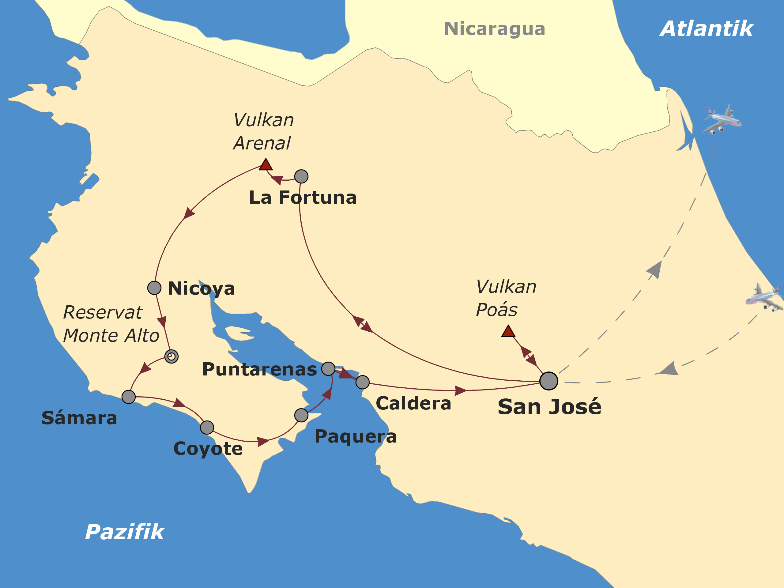 Sie fahren mit einem erfahrenen Guide auf ausgesuchten Routen durch einige der schönsten Landschaften, an den Vulkanen Poás und Arenal, Regenwäldern, Seen und Traumstränden entlang, in Naturschutzgebiete und ökotouristische Projekte, überqueren den Golf und die Halbinsel von Nicoya, die ideal zum Biken ist. Unser Guide zeigt Ihnen viele Attraktionen des Landes und vermittelt Ihnen einen Einblick in Biologie und Ökologie, soziale und wirtschaftliche Hintergründe sowie in Kultur und Lebensweise der Ticos, wie sich die CostaricanerInnen selbst nennen.
