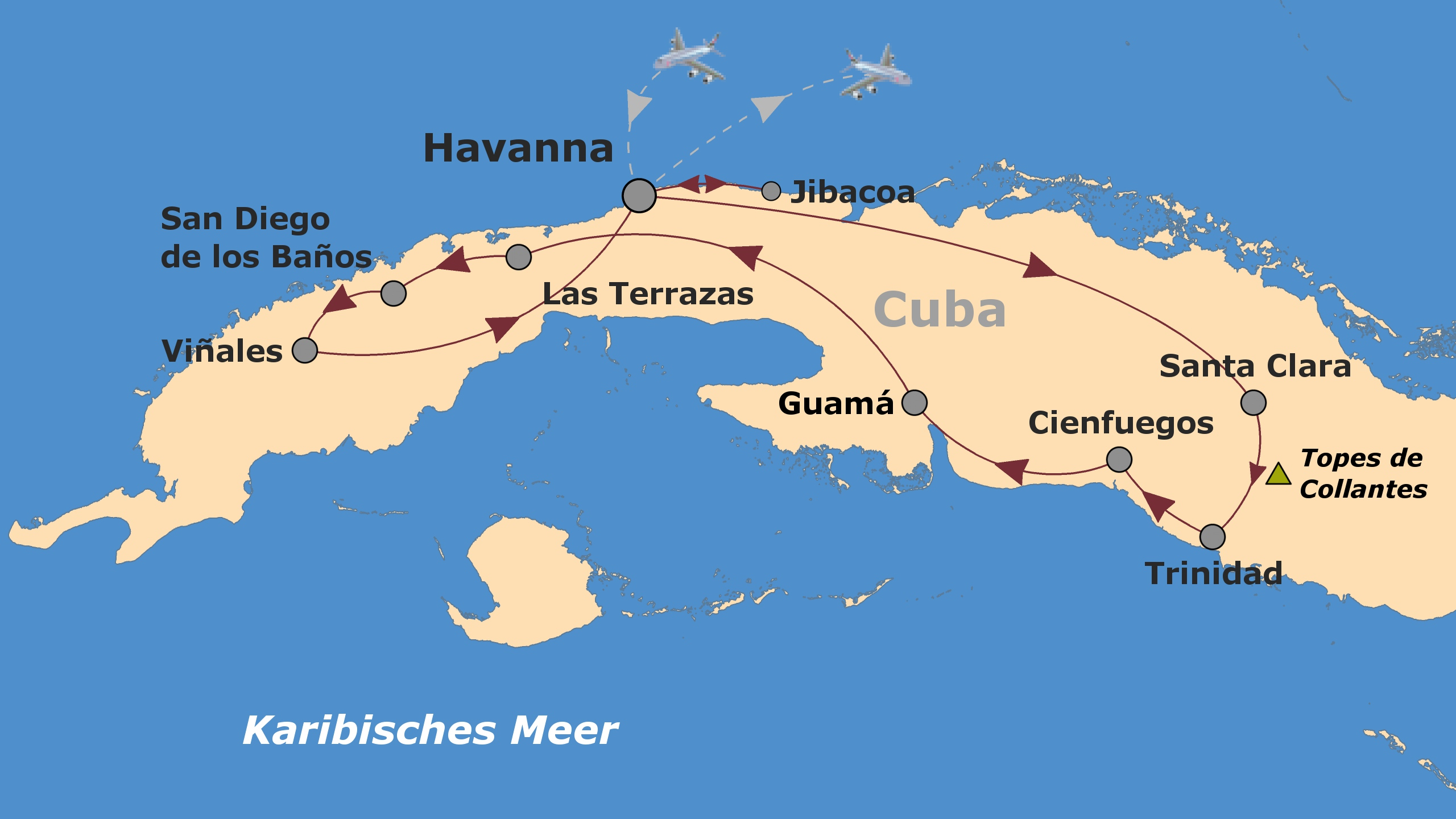 - + Dieser Termin findet (aufgrund einer Flugtagstreichung der Iberia) mit Flügen der Condor nach/von Varadero statt. Das weitere Programm verläuft ansonsten wie ausgeschrieben, lediglich der Transfer ist etwas länger.